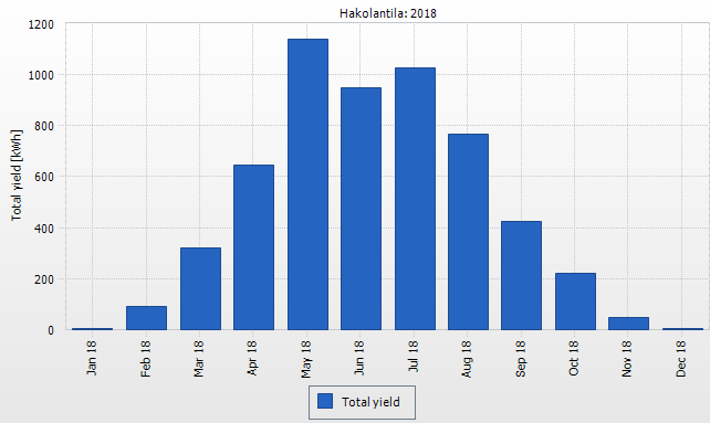 Alkujaan ennen paneelikenttien laajennusta aurinkopaneelien yhteenlaskettu teho oli 6,48 pkW ja vuonna 2018 vuosituotanto oli n. 5600 kWh. Tuolloin ei vielä ollut kuormanohjausta käytössä ja itsetuotetusta aurinkosähköstä meni myyntiin n. 1500 kWh eli n. 27 % tuotannosta.